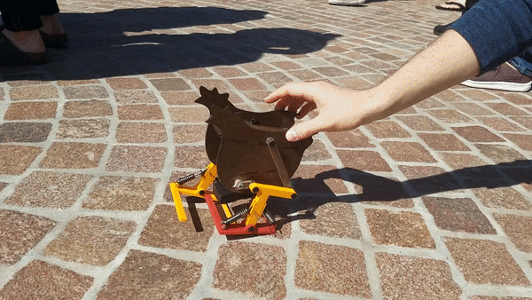Overall, our chicken was quite successful given its size and weight of 400.0 grams. On testing day, the chicken traversed the pavement and cobblestone without falling. The springs on the feet proved to be advantageous as the chicken walked in quite a straight path, aside from its trajectory being changed by large gaps in the pavement. Notably, our design was also awarded “Most Biomimetic” at the 2017 Living Machines Conference.